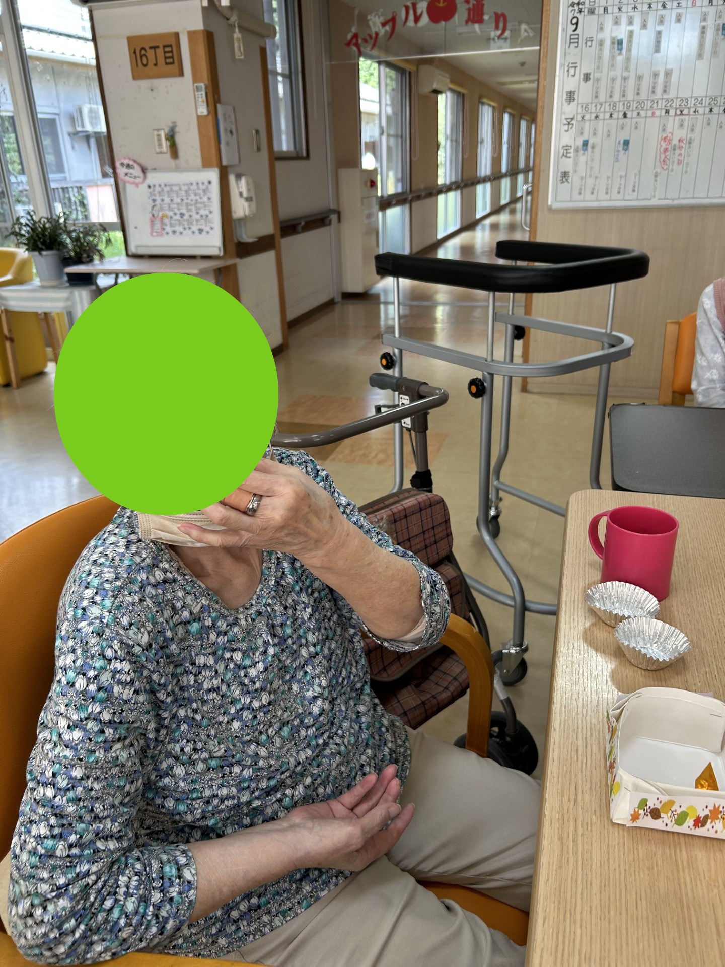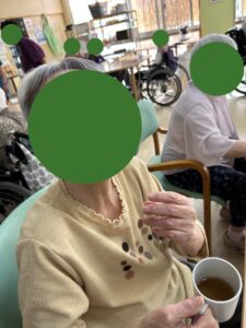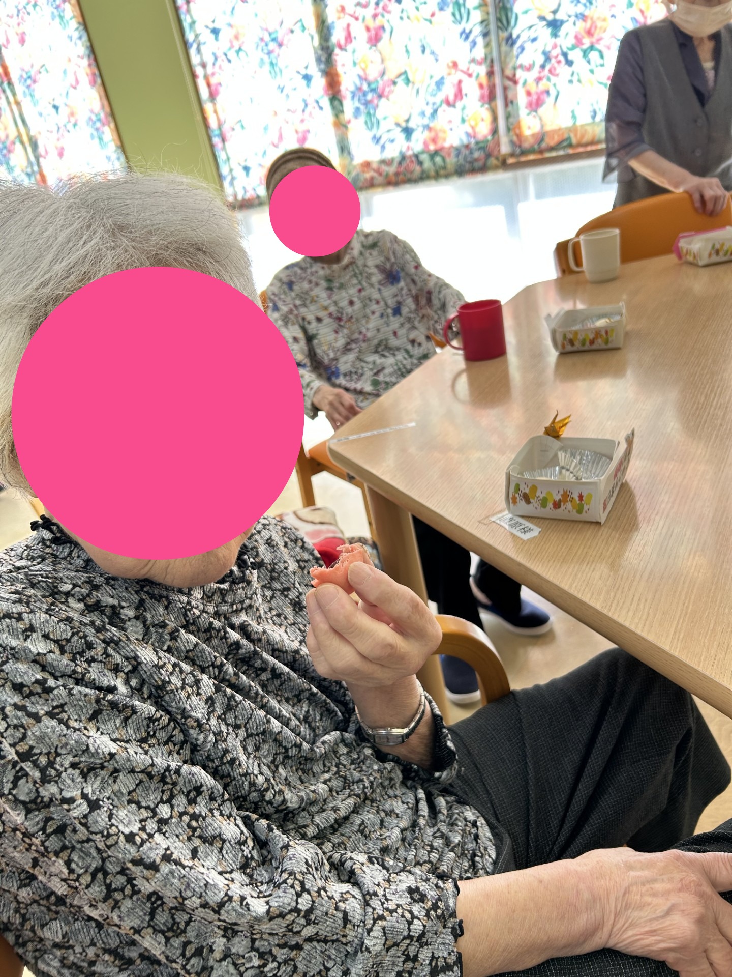 そして午後のおやつは素敵な節目をお祝いして、皆さまと紅白まんじゅうを食べました!皆さまとても美味そうに食べておられました!